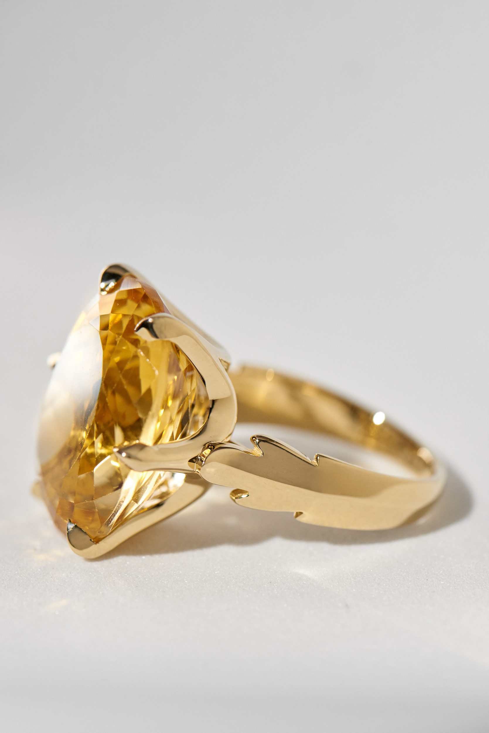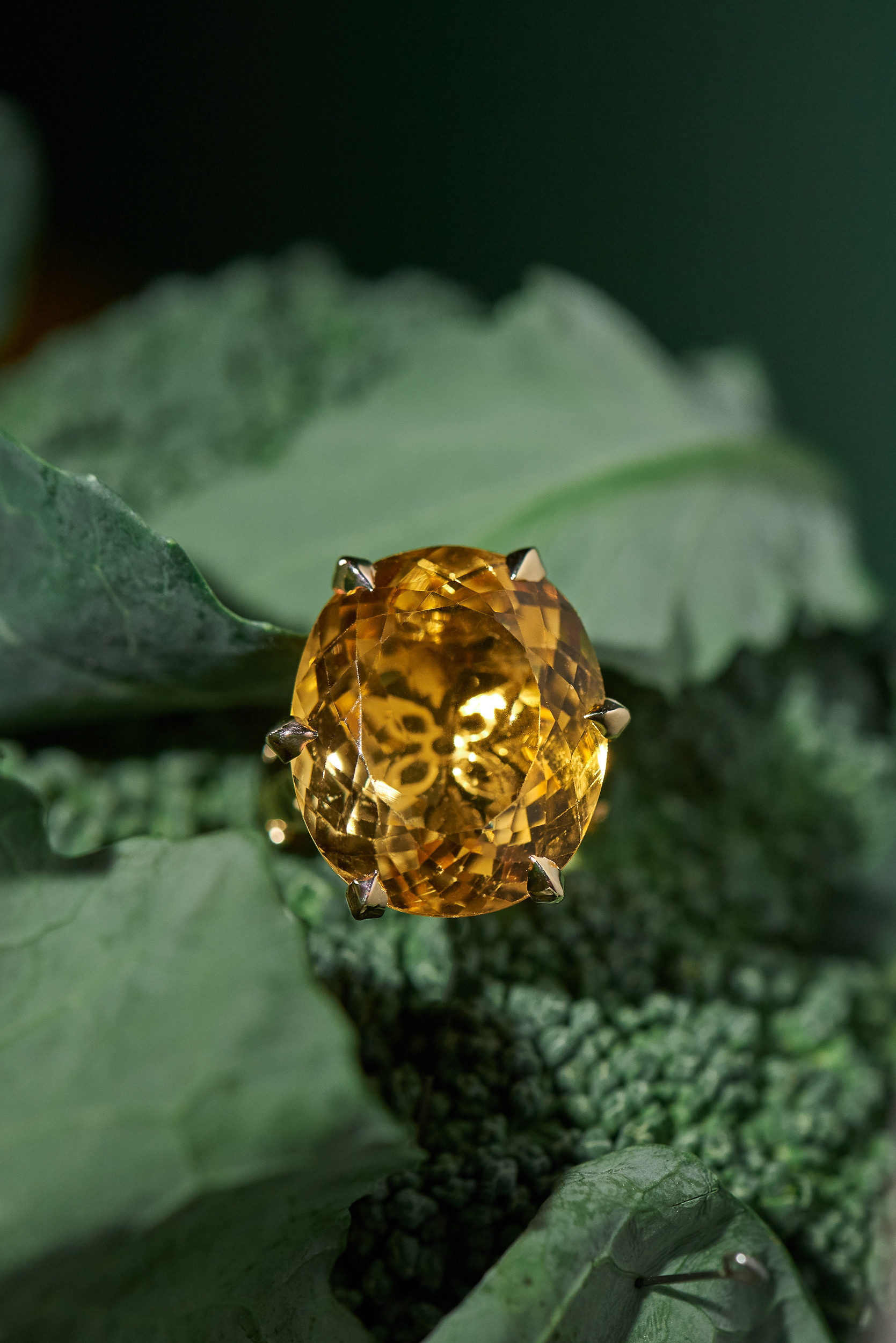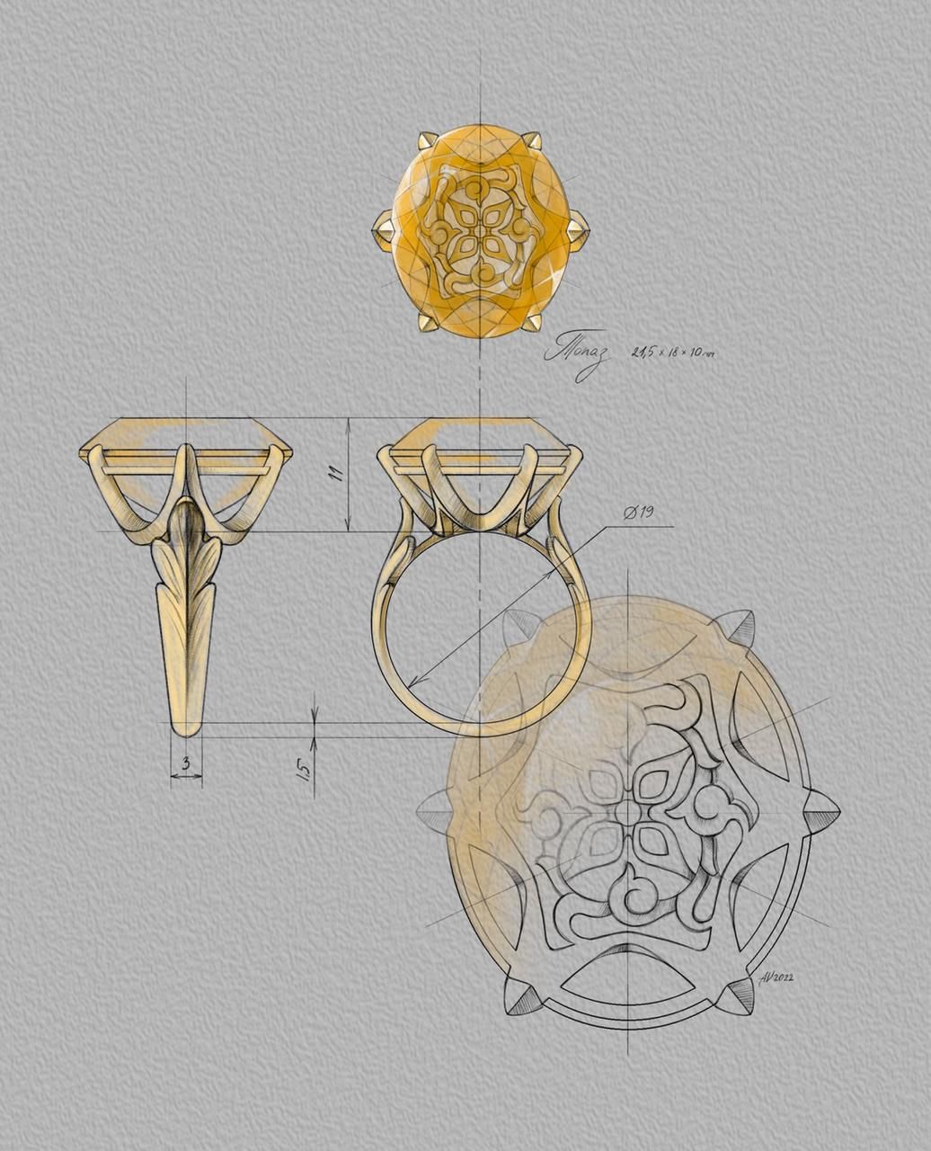 Хозяйка камня не захотела переогранять, поэтому вторым предложением было создать оправу с рисунком, который было бы видно сквозь камень. За счет металла камень наберет цвет, а в "окне" будет виден узор.